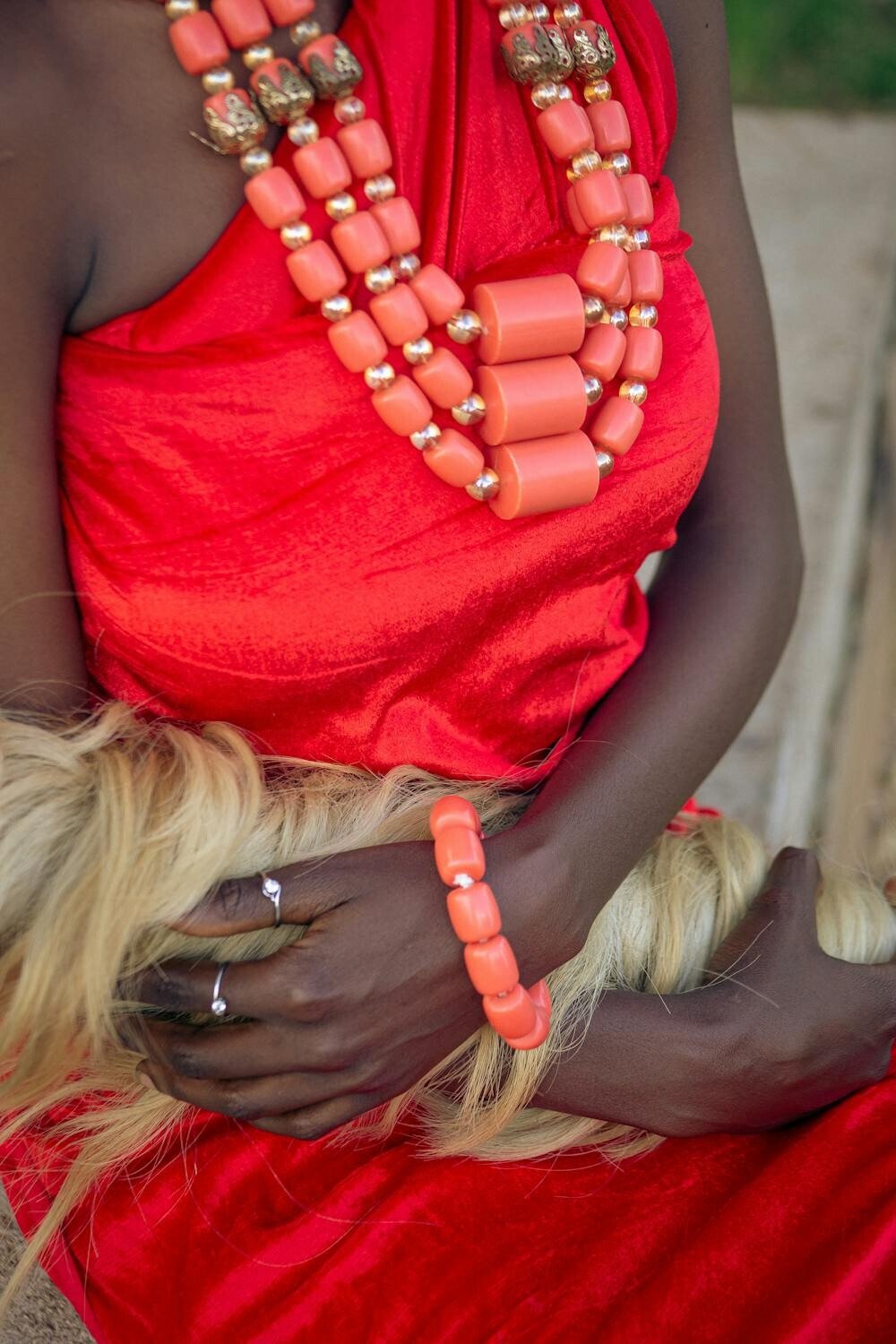 The braided design adds texture and interest to the piece. It’s a fun way to wear coral without being too formal.