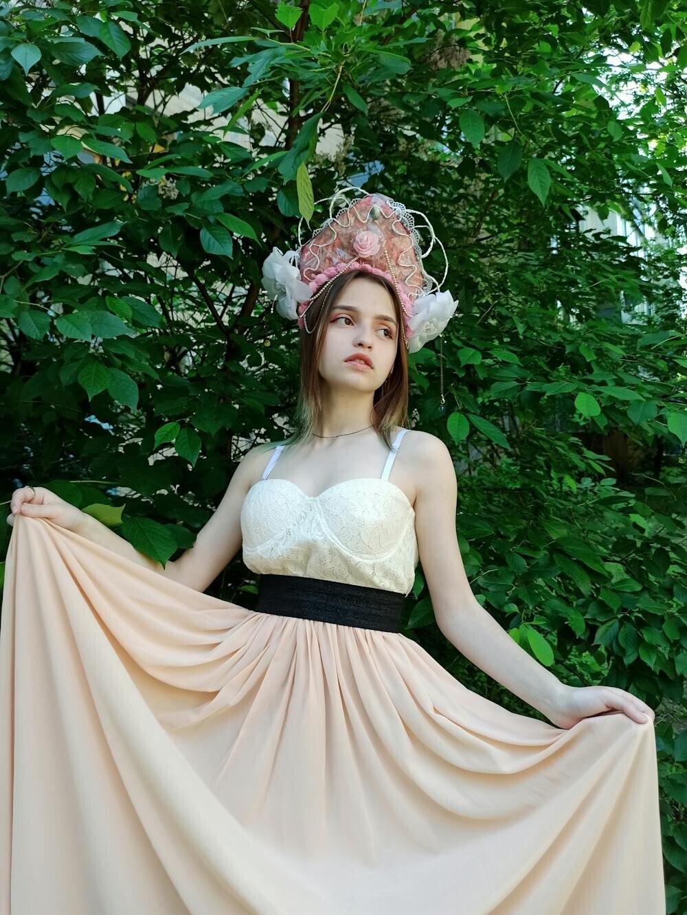 Roses and ivy create a romantic and lush crown, ideal for a garden wedding. It’s perfect for brides who love a natural yet elegant look.