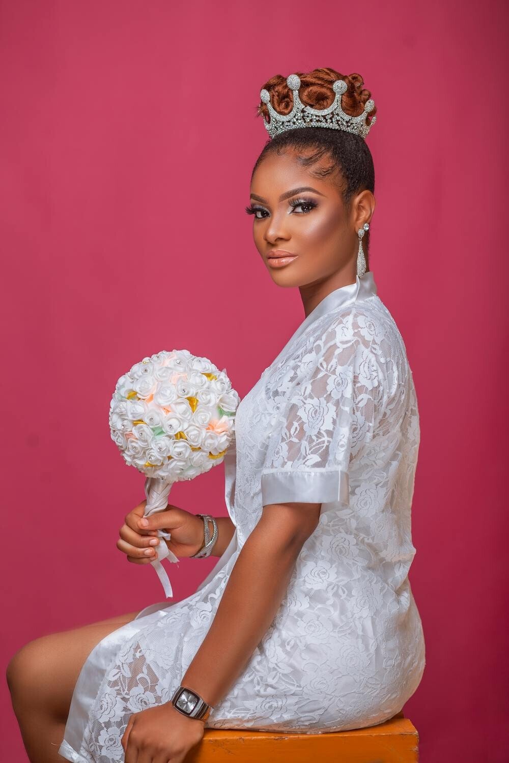 The simplicity of white roses ensures they complement any gown. This crown is unique because it exudes grace effortlessly.