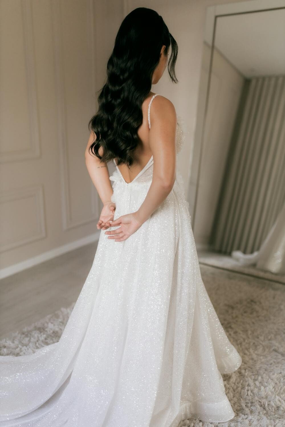 Sequins on a mermaid gown bring a touch of glam and sparkle, capturing the light beautifully. It’s a bold choice for brides who love to shine.